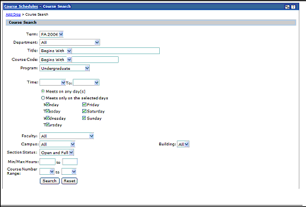The Course Search screen allows the user to search for a class by Term, Department, Title, Course Code, Program, Time of Class, Days of Class, Faculty, Campus, Section Status, Hours, Building, or Course Numbers. When searching by Course Code or Title, the user can search for text that Begins With, Ends With, Contains or is an Exact Match to the text entered.